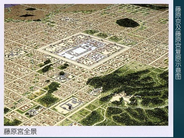 飛鳥(niǎo)-奈良時(shí)代對(duì)作為中央集權(quán)國(guó)家的象征的都城建設(shè),極其重視。藤原京是持統(tǒng)、元明、元正三代天皇延用了16年的都城遺址,這個(gè)遺址經(jīng)過(guò)幾十年的考古發(fā)掘,已經(jīng)探明了藤原京和藤原宮的范圍及布局(圖二十)。京城東西及南北各長(zhǎng)5.3km,平面近正方形,宮城在其中央,這點(diǎn)與唐長(zhǎng)安城不同。有學(xué)者認(rèn)為,藤原京是以《周禮》規(guī)定的理想化都城建制為依據(jù)所筑成的。