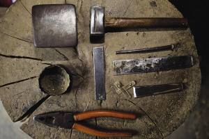 制蘆笙的幾個(gè)關(guān)鍵技術(shù)活——安簧片、點(diǎn)鉛、校音等工序,得由楊枝光親自上。他從工具箱里翻出一只薄薄的銅片,先是湊近看了看,中指輕彈了銅片后把它放到耳朵邊聽,似乎覺得聲音不太悅耳,于是又把銅片放在砧上用鐵錘敲打,再看、再彈、再聽……反復(fù)四五遍后,他總算滿意了,這才把銅片粘在笙管底端開口處。裝入簧片,蘆笙才算安裝好。