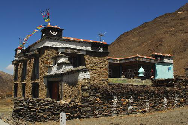 碉房是藏族很具代表性的民居之一,多為石木結(jié)構(gòu),外形端莊穩(wěn)固,風格古樸粗獷。碉房一般有三到四層。底層養(yǎng)牲口和堆放飼料、雜物;二層布置臥室、廚房等;三層設(shè)有經(jīng)堂。由于藏族信仰藏傳佛教,誦經(jīng)拜佛的經(jīng)堂占有重要位置,神位上方不能住人或堆放雜物,所以都設(shè)在房屋的頂層。為了擴大室內(nèi)空間,二層常挑出墻外,輕巧的挑樓與厚重的石砌墻體形成鮮明的對比,建筑外形因此富于變化。