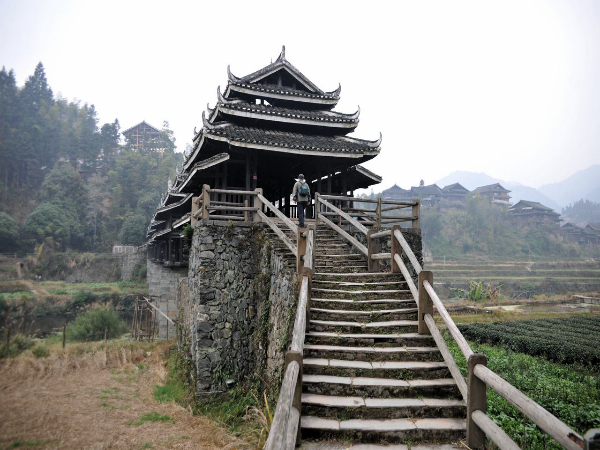 風(fēng)雨橋以石拱木作,廊、屋、亭、閣為一體,造型別致、美不勝收。無論是遠眺還是進觀,都體現(xiàn)出獨特的審美意境。鏈接廊橋與屋亭的是長條青石,橋與村寨的連接則用花石鋪路,橋面主體是當(dāng)?shù)厮寄静?。這種自然生態(tài)環(huán)保的理念,更彰顯了瑤族人民獨特的審美境界。