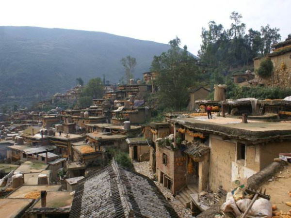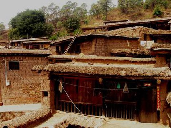 彝族是農(nóng)牧兼營的民族,村寨的分布與坐落有其獨特的傳承。彝族的村寨多坐落在海拔2000~3000米的山區(qū)、半山區(qū),相沿聚族而居。為適應(yīng)西南地區(qū)亞熱帶氣候和山地特點,彝民們便就地取材,以一種最容易、最節(jié)省錢財人力的建房方式,創(chuàng)造出中國建筑的獨特樣式——土掌房。土掌房多建于山地斜坡上,以石為墻基,用土坯砌墻或用土筑墻,墻上架梁,梁上鋪木板、木條或竹子,上面再鋪一層土,經(jīng)灑水抿捶,形成平臺房頂,不漏雨水。有的大梁架在木柱上,擔上墊木,鋪茅草或稻草,草上覆蓋稀泥,再放細土捶實而成。