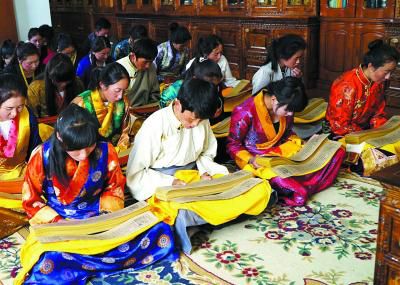 西藏藏醫(yī)學(xué)院的學(xué)生正在研讀記載著藏醫(yī)藥浴法相關(guān)知識的《四部醫(yī)典》。劉罡 攝