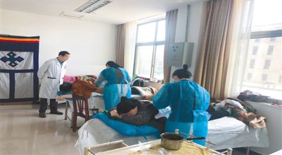 西藏自治區(qū)藏醫(yī)院藏醫(yī)藥浴中心負責(zé)人次仁桑珠,在為患者做藏醫(yī)藥浴治療。