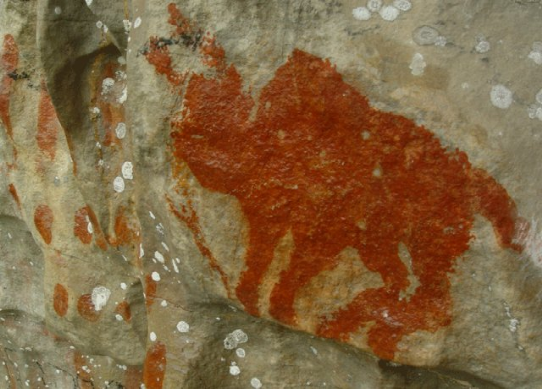 巖畫(huà)在石壁低部?jī)?nèi)凹,可避雨,并有四處洞穴,依次下降,位置較高者為一出水洞,四季有水,其它洞穴開(kāi)口小,內(nèi)部較寬、干燥,洞口處對(duì)應(yīng)石壁項(xiàng)部有明顯煙熏遺跡,似人為造成。