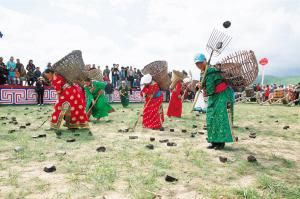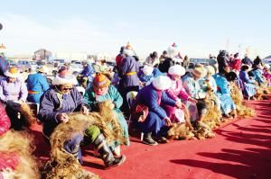 當(dāng)然,后來(lái)那達(dá)慕增加了許多新項(xiàng)目,比如賽駱駝、提水、縫蒙古袍扣子、撿牛糞、打斷牛骨比賽、蒙古象棋比賽、沙嘎(羊拐)比賽等。在北京舉辦的那達(dá)慕里,還融入了現(xiàn)代三大球類(lèi)比賽項(xiàng)目,為了集體參與,增加了拔河比賽、扔沙包、服飾比賽、兒童說(shuō)蒙古語(yǔ)比賽、兒童唱歌比賽等。