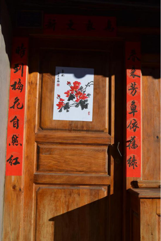 寫春聯(lián)繪年畫的傳統(tǒng)在劍川縣金華鎮(zhèn)由來已久,明朝洪武年間改土歸流和移民屯邊制度的推行,使儒家文化、理學(xué)思想逐漸融入邊疆人民的生活。金華古鎮(zhèn)居民受此影響,走上追求仕途功名的道路,文人鄉(xiāng)紳都以顯示儒學(xué)身份為榮。每逢春節(jié),人們會(huì)邀請(qǐng)有功名的仕子或傳學(xué)明經(jīng)的文人來到家中,撰寫對(duì)聯(lián),同時(shí)根據(jù)時(shí)令畫上一兩幅門神畫,希望通過此舉祈愿自家后生求得功名。如今走在金華古鎮(zhèn)西門街上,仍能看到家家種花養(yǎng)草,戶戶楹聯(lián)盈門,一派文風(fēng)蔚然的生機(jī)。