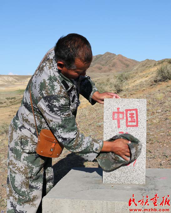 馬合沙提 ·斯拉木精心維護(hù)界碑(趙利 攝影)
