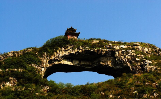 仙橋山位于貴州甕安縣城西南5公里的仙橋村,雄峙于南北伸展的長嶺之巔。山頂有一長方形穿洞,遠望似一面中天明鏡,又若仕女發(fā)髻上的一匹玉簪。民間傳說,那高懸的“橋洞”,是神通廣大的仙人張三豐發(fā)怒時一拳擊穿的。站在“橋”下仰望“橋”頂,如巨粱橫亙天際,青崖黛壁,輝映云天。天衣無縫的“橋身”和兩邊的“橋墩”,渾然一體,構成跨度約40米,寬20米,高約35米的“橋拱”。“橋拱”北面的“橋墩”腳有形狀各異的石洞,曲徑相通。洞壁有形似人腳印石凹,傳說是仙人張三豐到此云游留下的足跡。