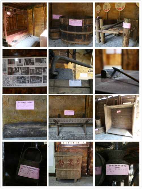 “農(nóng)耕文化陳列館”是由兩棟傳統(tǒng)的木質(zhì)民房改建,從大門進(jìn)來,門的兩邊放置有農(nóng)具,右側(cè)一個(gè)是存儲(chǔ)糧食的倉庫,沿著倉庫邊上的石階往上走,從小門進(jìn)去,大大小小的簸箕、飯甑、貓籮、魚籮等農(nóng)具應(yīng)有盡有。