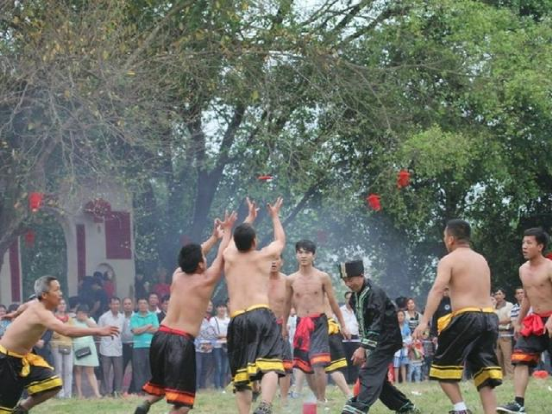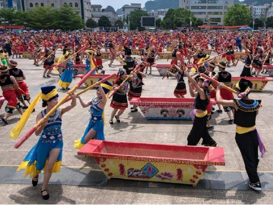 打榔舞,是崇左市天等縣的壯族傳統(tǒng)民俗舞蹈,用于酬神、還愿、祭祀、娛樂等活動,起源于唐代武德年間。打榔舞主要道具為木榔,音樂響起后,每人用一米多長的木杵有節(jié)奏的敲擊榔壁、榔底和榔邊,動作歡快有力,以此來表達壯族人民對五谷豐登、六畜興旺、幸福吉祥的祈求和渴望。表演者不分男女老少,有二人對打、四人對打、多人交錯對打等多種方式。