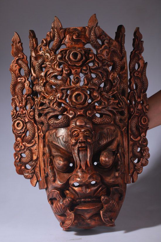 描述:程咬金,字義貞,原名咬金,后更名知節(jié)。驍勇善戰(zhàn),歷史上是唐朝開國名將,以“三板斧”的形象在民間廣為流傳。在地戲唱本《薛仁貴征東》和《薛丁山征西》中,均有程咬金的出場。根據(jù)《隋唐演義》的內(nèi)容,程咬金雖然頭腦簡單,卻是個(gè)有福之人,被認(rèn)為是福將,所以在地戲面具的刻畫上,在嘴角兩側(cè)雕刻上一堆蝙蝠,以取“?!钡闹C音。又因?yàn)槌桃Ы鹪谔拼闶情L壽之人,故爾額頭上刻一壽星,帶給人福壽雙全的吉祥含義。