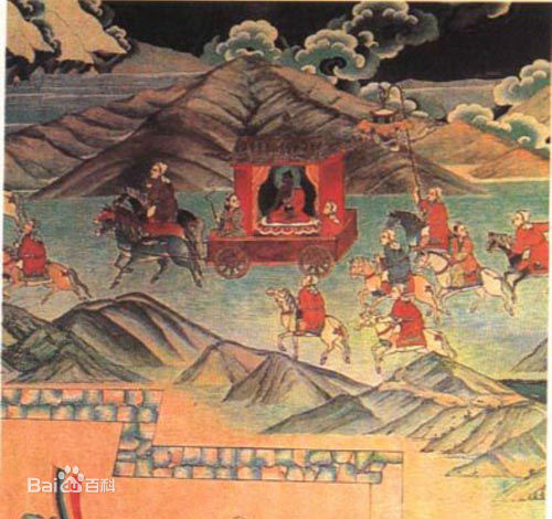 貞觀15年(641)正月十五,唐太宗將文成公主下嫁松贊干布,詔令江夏王李道宗持節(jié)護(hù)送。文成公主在唐送親使江夏王太宗族弟李道宗和吐蕃迎親專(zhuān)使祿東贊的伴隨下,前往吐蕃。文成公主一行從長(zhǎng)安出發(fā),途經(jīng)西寧,翻日月山,長(zhǎng)途跋涉到達(dá)拉薩。 松贊干布率群臣到河源附近的柏海(今青海瑪多縣境內(nèi))迎接文成公主,謁見(jiàn)李道宗,行子婿之禮。之后與公主同返邏些(今拉薩),為公主筑城、修建宮室。