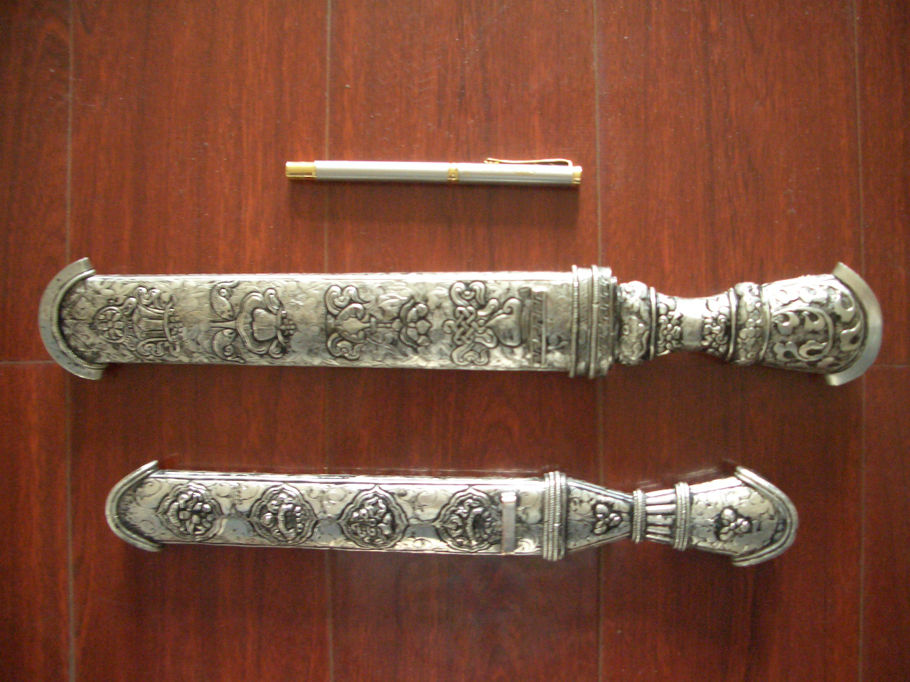 藏刀具有生產(chǎn)、生活、自衛(wèi)、裝飾4種用途,已有1600多年的生產(chǎn)歷史,做工講究,刀身用鋼材鍛,刀柄用牛角或硬質(zhì)木料加工而成。從規(guī)格尺寸上分,藏刀大致為長刀、短刀和小刀三種。長刀最長的有一米多,短刀約40厘米左右,小刀則僅有十幾厘米長。從形狀上講,具有很強的地方特色,有牧區(qū)式、康巴式、后藏式等區(qū)別;用途也有很多種,如林區(qū)砍樹有專門的砍樹刀,屠夫用的屠宰刀等。 藏刀把多用以牛角、牛骨或木材制成,較高檔的刀把用銀絲、銅絲等纏繞,刀鞘則更為講究,較簡單的有木鞘或皮套外,多數(shù)是包黃銅、白銅,甚至包白銀、鍍金等,上面刻有精美的飛禽走獸及花草等各種圖案,有的還鑲嵌各種寶石、彩石,顯得華麗和富有。拉孜生產(chǎn)的藏力,歷史悠久,樣式美觀,淬火適中,刀刃鋒銳,再配上精致、貴重的刀鞘,雕著龍、鳳、虎、獅和錦花圖案,精美的藏刀大都出自能工巧匠之手。由于鍛打精致,鐫刻細膩,色彩奪目,并附有藏文,系有五顏六色柄穗,形成別具一格的藏族工藝品。藏刀的主要加工材料有銀、銅(白銅、黃銅、紫銅)、鐵、鯊魚、牛角、瑪瑙、硬雜木等。過程有冶煉熔化、模具翻鑄、敲摳大形、刻花鑲嵌、焊接組合、加固、銼磨整形、精雕細刻及鎂洗拋光等工序。