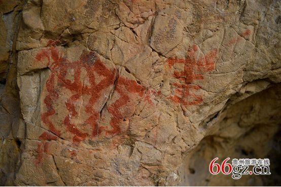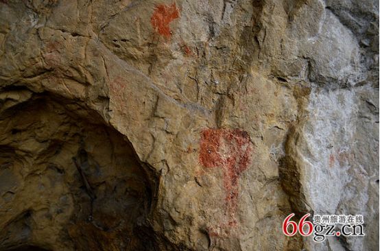 據(jù)資料載,金山洞古代崖畫以赭色涂繪人、馬、狗等等,隱約可見形態(tài)各異的大小圖像二三十個。人物多作行走狀,亦有雙手高舉者,似乎在祈禱。從其畫風(fēng)觀察,與相距不遠的省級文物保護單位--長順龍家院崖畫十分相似。